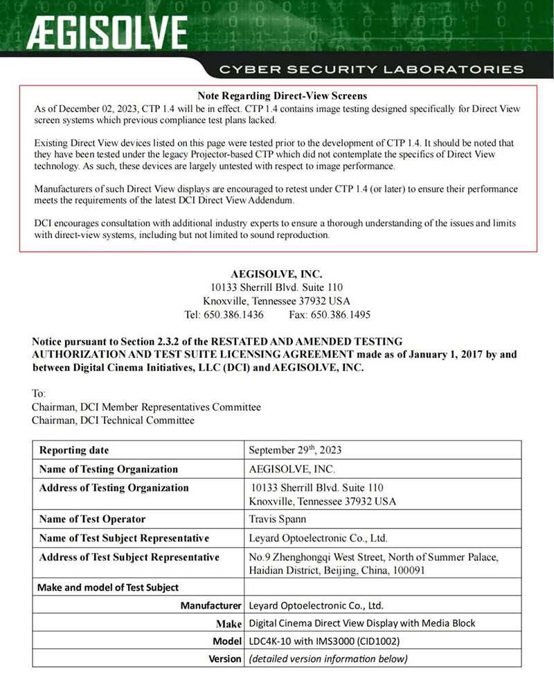 11月3日,利亚德又一款LED电影屏(4K 10米)通过DCI权威认证。至此,利亚德已有四款拥有自主知识产权的LED电影屏通过DCI认证。深耕显示领域近30载,利亚德依托自研、合作开发等多种方式,已成为目前行业内通过DCI认证最多、LED电影屏型号最全的企业。集团以强大的科技创新能力,持续探索LED电影屏在影院市场的应用,推动电影产业数字化、智能化创新发展。